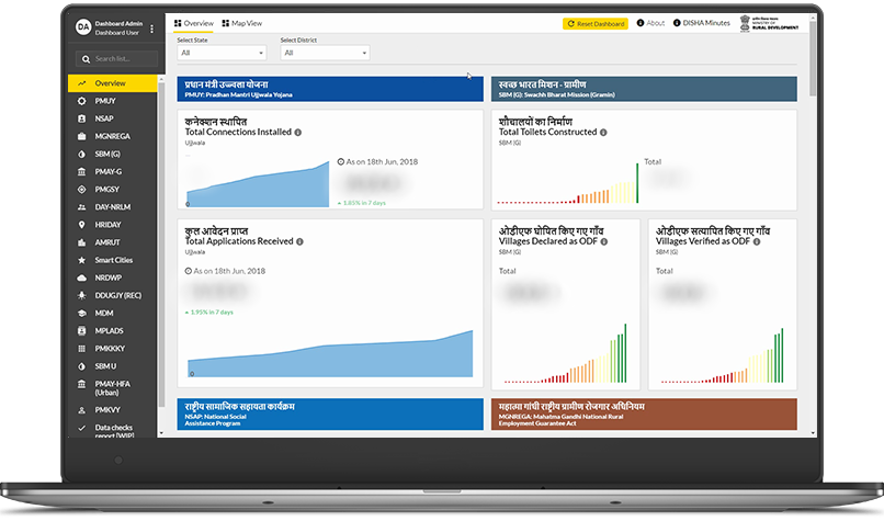 To jumpstart good governance, the DISHA Dashboard brings data from 42 flagship government schemes to one place for the first time. This helps government officials at all levels explore and assess key government initiatives for any geographic level, at any time period.