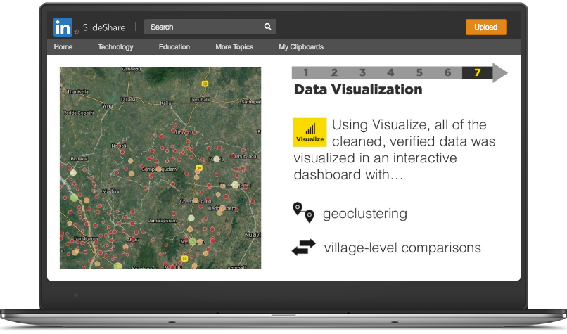 Every day, 5 to 10 thousand survey responses — with a total of 1.5 million data points — came in from the field. This data was cleaned, verified and structured to build aggregate village prodiles, development indices, and priority scores. We then visualized this data in two interactive dashboards with geoclustering, household-level views, village profiles, and intelligent querying tools.